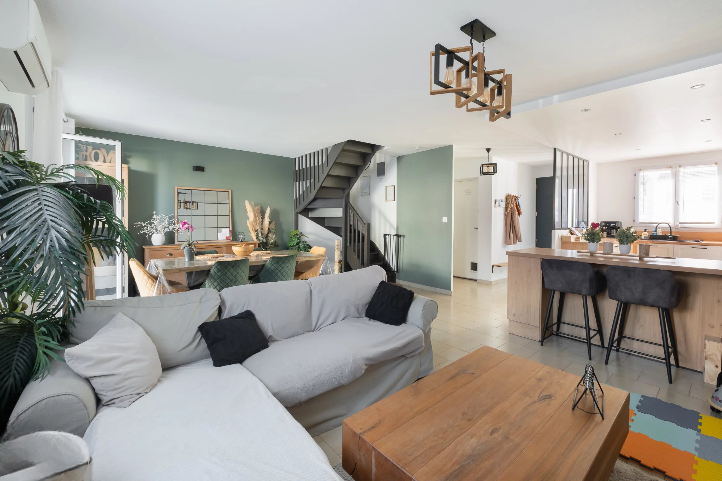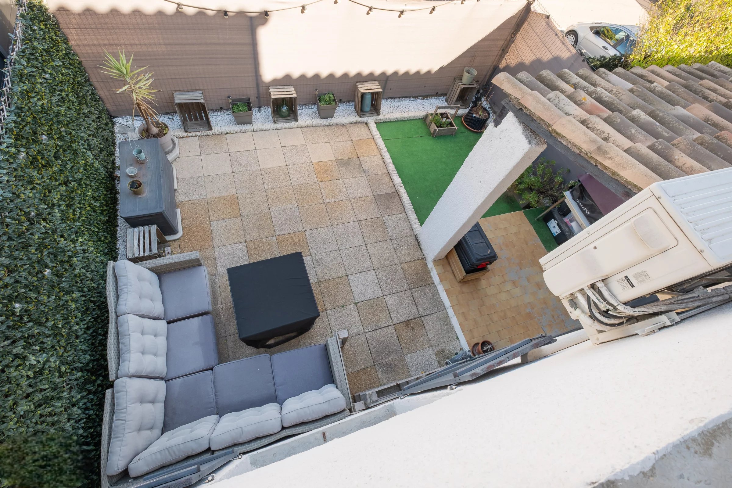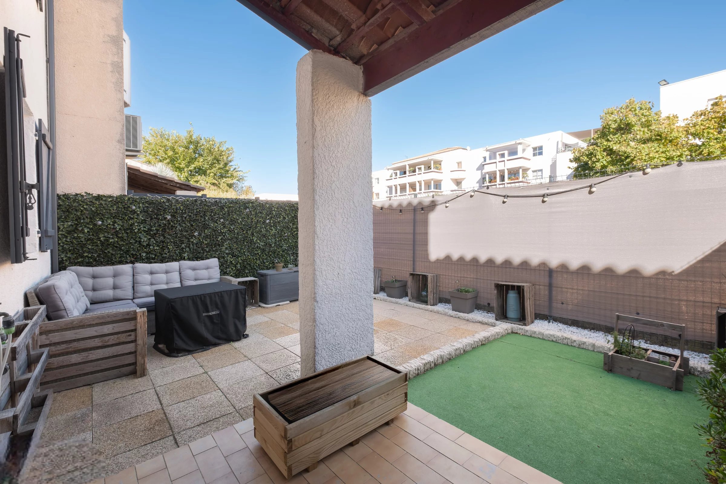 Vous bénéficierez d'un grand séjour avec une jolie cuisine ouverte et équipée qui donne sur un extérieur de 40m2 environ, suffisant pour passer de bons moments en famille ou entre amis.